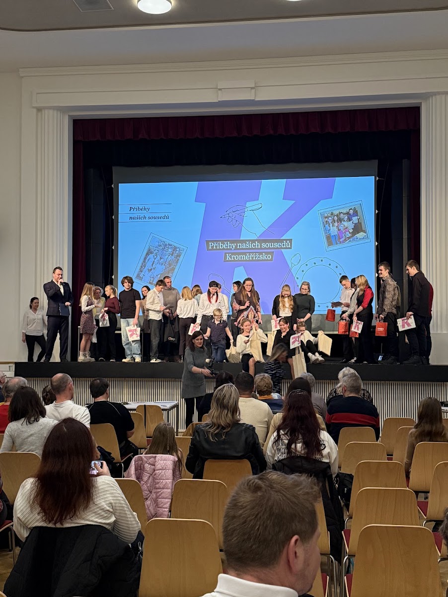 V úterý 4. března 2025 proběhla na sále Sokololovny slavnostní závěrečná prezentace projektu Příběhy našich sousedů, kde se prezentovali s jednotlivými příběhy pamětníků žáci základních škol a studenti gymnázia. Jednotlivé osudy pamětníků prezentovali volnou formou před návštěvníky, kteří byli seznámeni i s nahrávkami, které žáci a studenti s pamětníky pořídili. Konkrétně své práce předvedli žáci ZŠ-S-MYSL Kroměříž – příběh Anny Hořčicové, ZŠ Morkovice – příběh Stanislavy Jägerové, ZŠ Chropyně – příběh Pavla Rozsypálka a domácí kojetínští gymnazisté s příběhem Boženy Novotné, jejíhož tatínka, Jindřicha Riegla za 2. sv. války odvleklo gestapo a byl umučen v koncentračním táboře Osvětim. Celý program moderoval Kvido Lotrek a vystoupili v něm i žáci ZUŠ Kojetín. Mimo samotných pamětníků byli přítomni i zástupci Post Bellum, škol i měst.