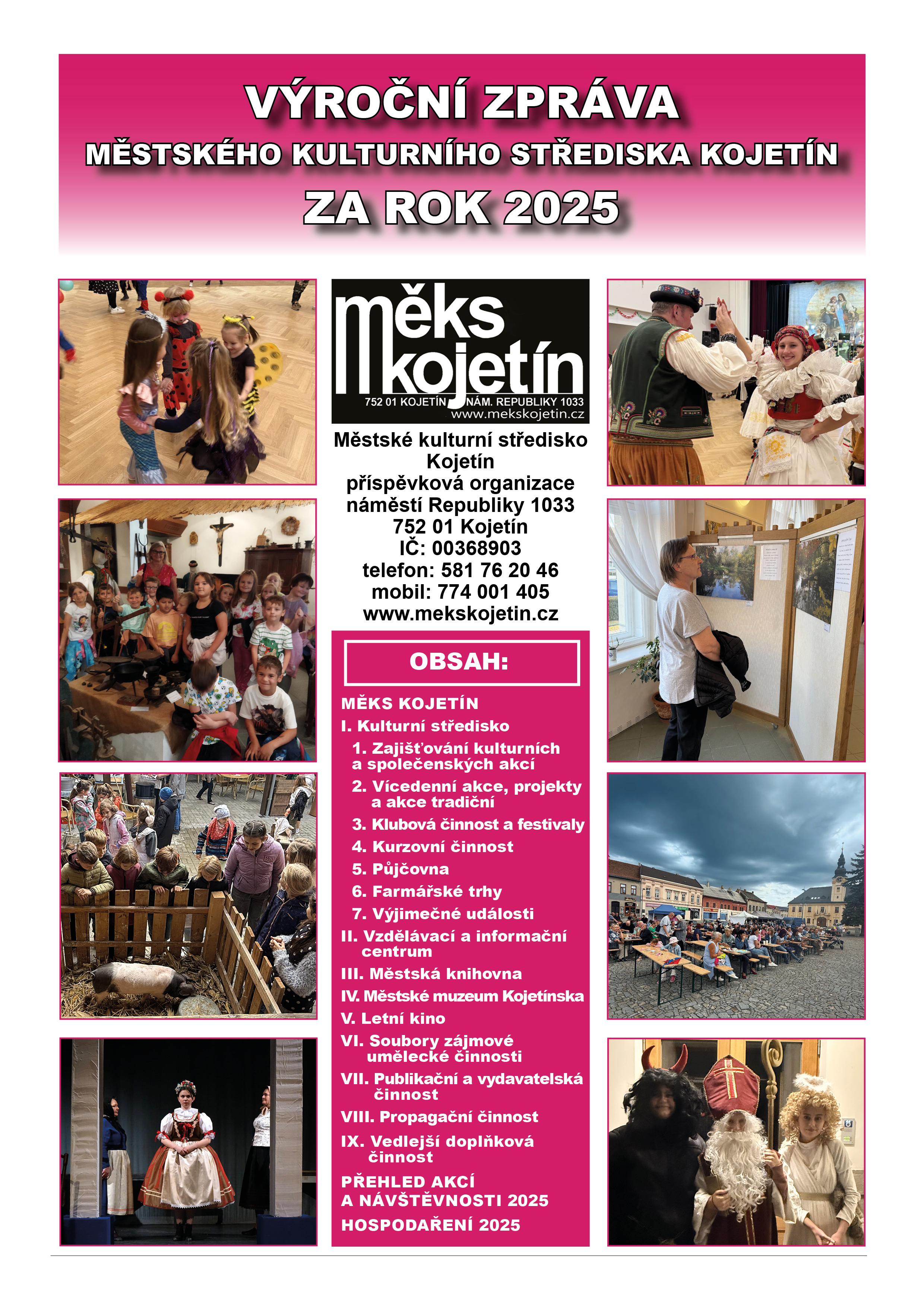 V lednu také rekapitulujeme uplynulý rok ve výroční zprávě, která se předkládá v březnu na jednání rady i zastupitelstva města. Městské kulturní středisko Kojetín, pod které spadá také informační centrum, muzeum, knihovna, letní kino i sedm zájmových souborů, ve své zprávě hodnotí uplynulé akce, počiny a veškerou celoroční práci za rok 2025. Výroční zprávy také zveřejňujeme na webových stánkách MěKS Kojetín.