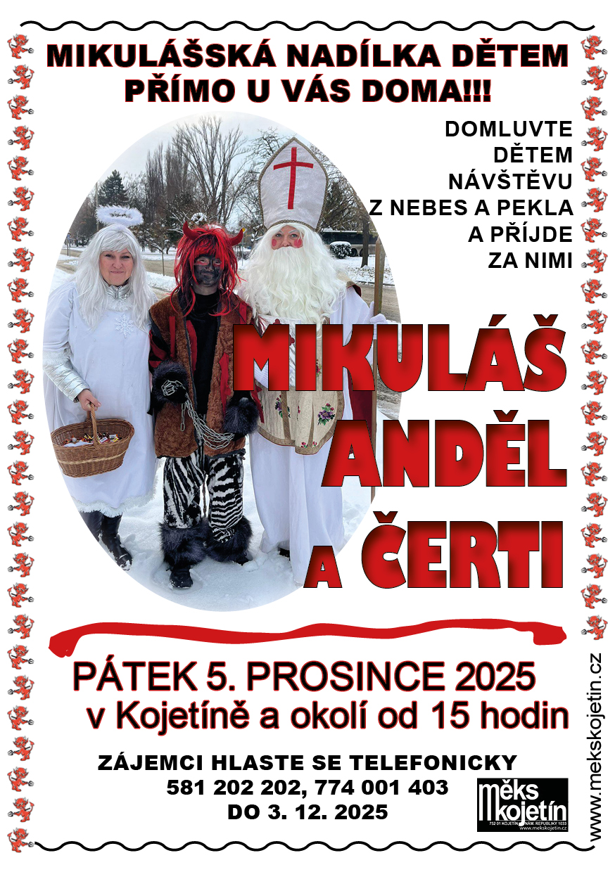 Návštěvy Mikuláše, anděla a čertů přímo k vám domů si můžete objednat na Vzdělávacím a informačním centru Kojetín, Masarykovo náměstí 8, telefon: 581 202 202, 774 001 403 do 3. prosince 2025