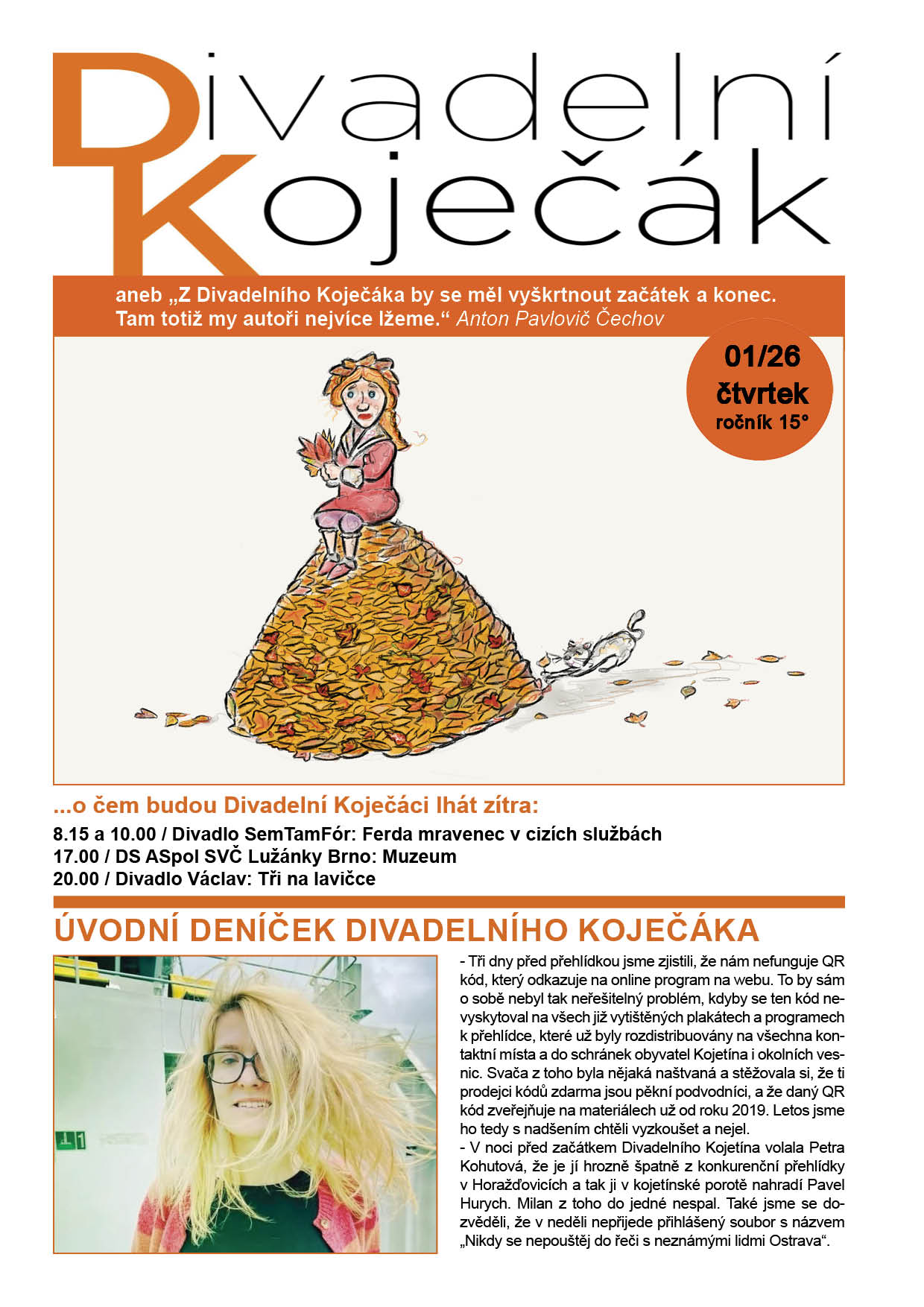 Datum publikace: 19.3.2026 Přinášíme a zveřejňujeme první číslo časopisu Divadelní Koječák, který bude přinášet report včetně fotografií z letošního Divadelního Kojetína. Čtěte: