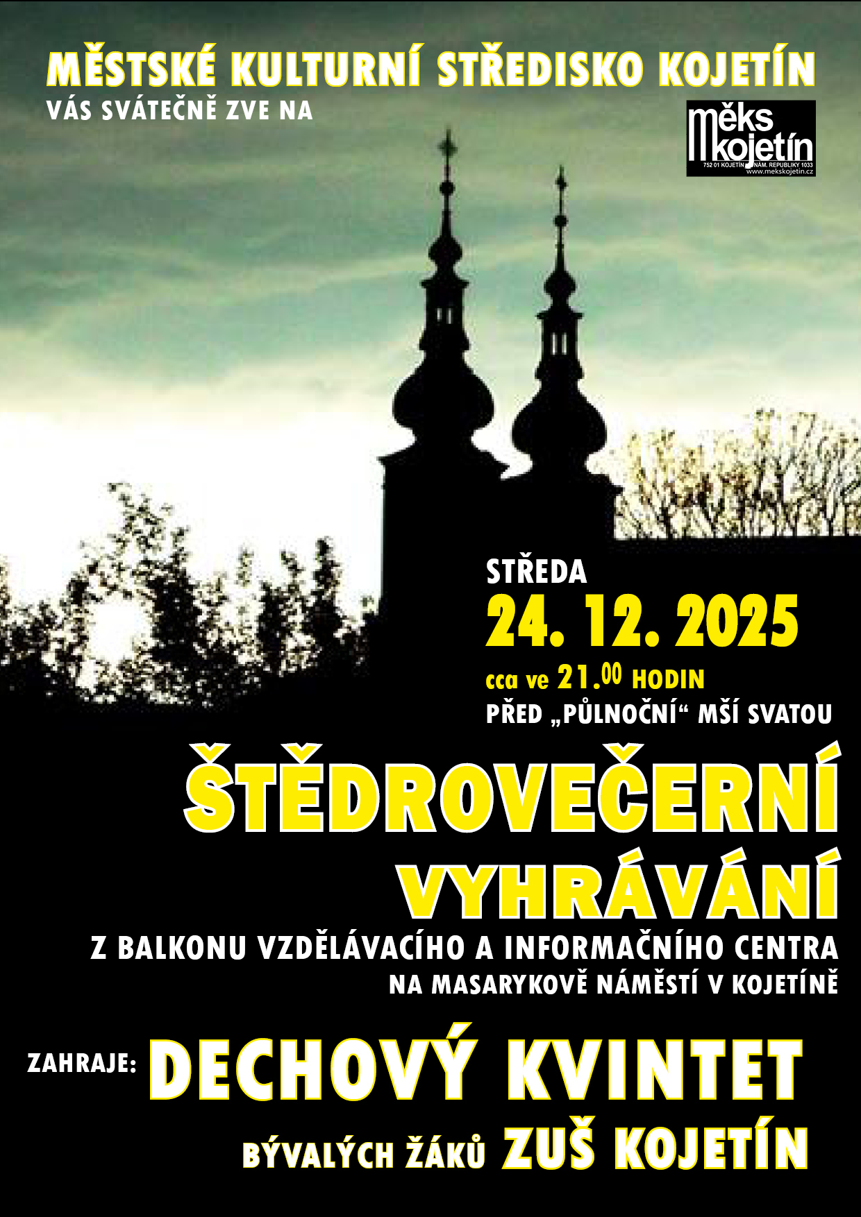 Datum publikace: 1.12.2025 MěKS Kojetín vás srdečně zve na krásnou kojetínskou tradici: Štědrovečerní vyhrávání Dechového kvintetu bývalých žáků ZUŠ Kojetín ve středu 24. prosince 2025 od 21 hodin z balkonu Vzdělávacího a informačního centra na Masarykově náměstí v Kojetíně Všichni jste srdečně zváni!
