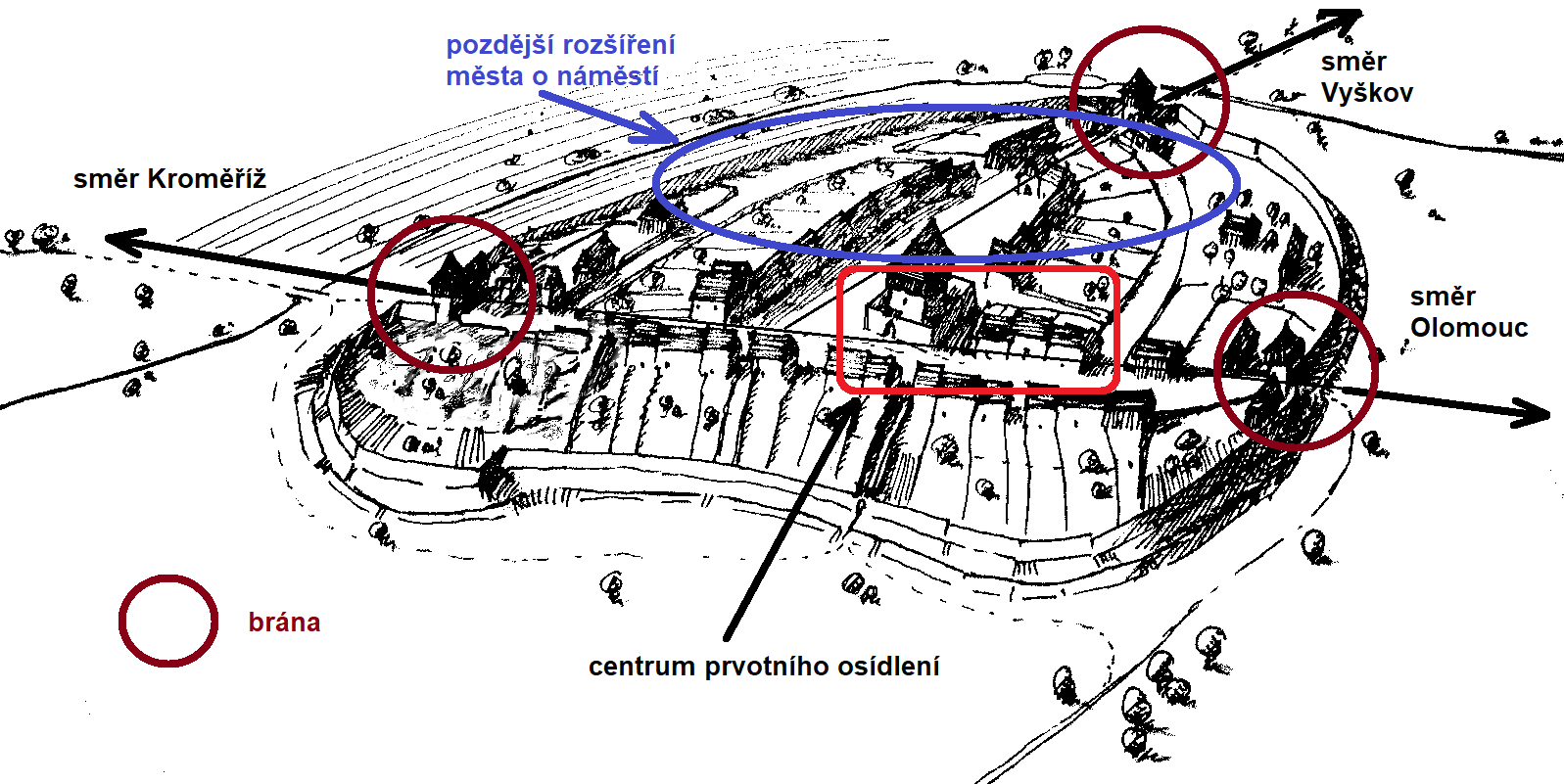 Obr. Pohled na umístění bran v Kojetíně v období 14. století.