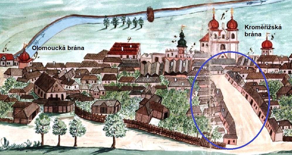 a Olomoucí a brána Vyškovská, pod níž cesta směřovala k městu Vyškov a dále do Brna.