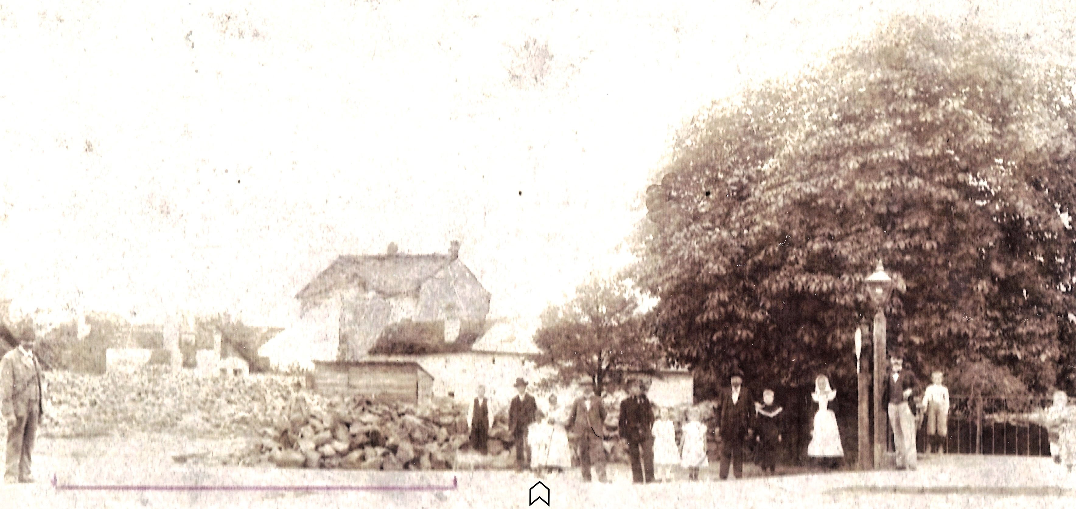 Obr. Pohled ze směru od kříže na místo zbouraného domu Františka Kotka na fotografii z roku 1901 nebo 1902. Uprostřed snímku stojí Kotkova rodina – 43letý František, 33letá manželka Františka, 6letá dcera Františka, jednoletou dceru Annu drží matka Františka v náručí (viz šipku dole). Ostatní osoby nalevo či napravo od uliční lampy nelze na snímku ztotožnit. Vlevo od rodiny Kotkových je hromada kamení, za stojícím mužem na levém okraji snímku je část zbytku městské zdi, vedle ní je dřevěná kůlna. V pozadí se tyčí dům číslo 674 se dvěma komíny, před nímž je pultová střecha patrně hospodářské budovy. Tmavá střecha se světlým komínem je součástí dvojdomku číslo 84 a 85, zbořeného před přístavbou školy v roce 1931.