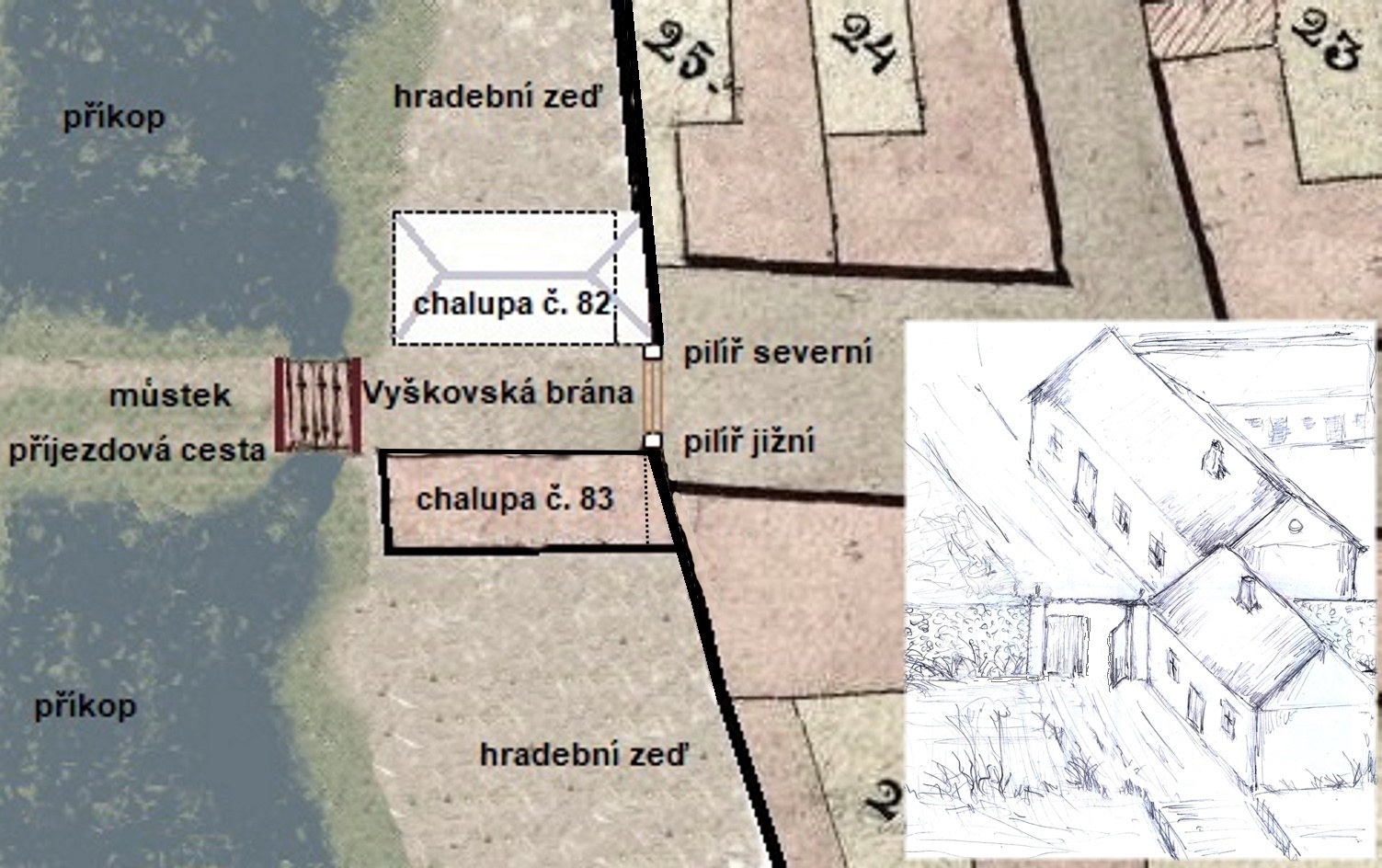 Obr. Situační poloha Vyškovské brány mezi chalupami číslo 82 a 83 na podkladu Indikační skici z roku 1833 a kresba tohoto místa při pohledu od Vyškovského předměstí bez později postavené chalupy číslo 82.