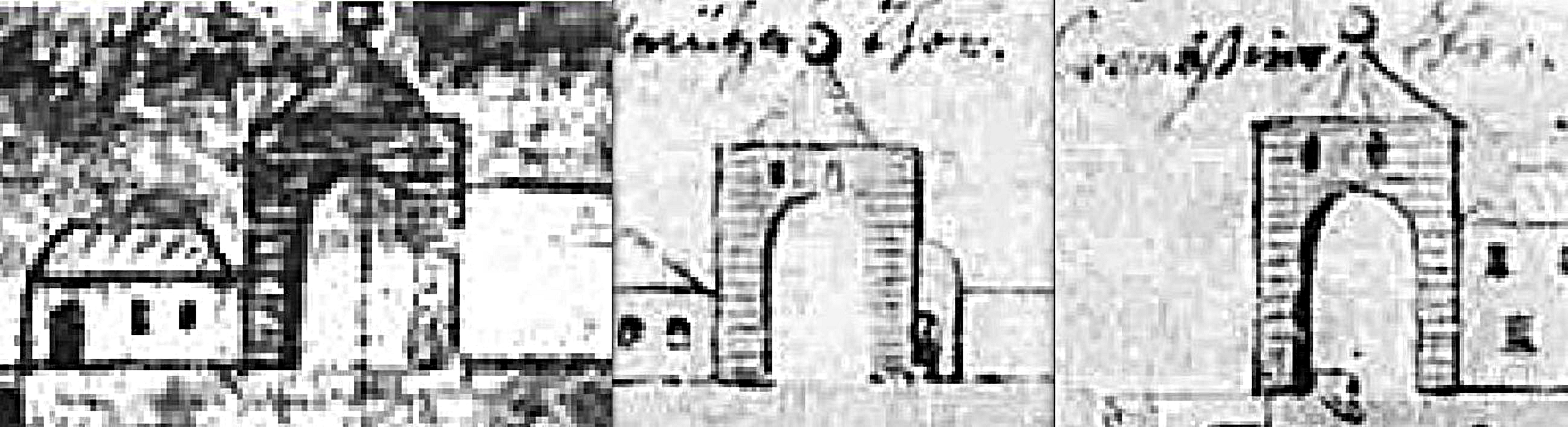 Kresba na pravé straně obrázku je detailnějším pohledem na jižní pilíř s přilehlou chalupou číslo 83 a oknem.