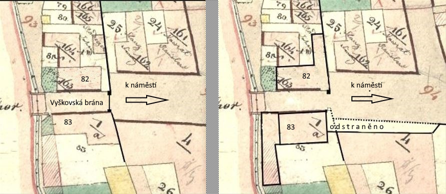 Obr. Mapa ukazuje polohu pilířů Vyškovské brány mezi chalupami číslo 82 a 83 v roce 1833. Mapa níže z roku 1883 znázorňuje stav brány po roce 1875, kdy došlo ke stavebním úpravách chalup číslo 83 a 26, při nichž byl jižní pilíř a část hradní zdi odstraněny.