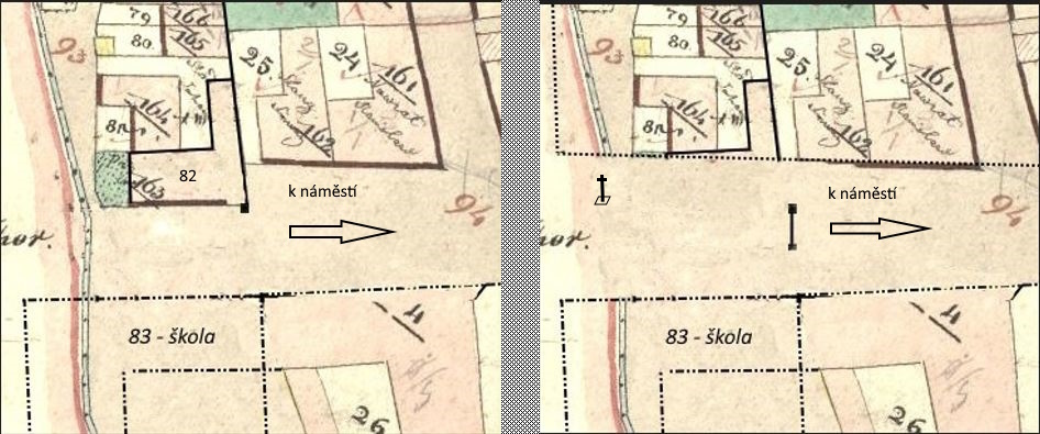A jak ukazuje mapa z roku 1883, došlo k přestavbě chalupy číslo 83 a 26. Část hradní zdi s jižním pilířem jsou již odstraněny a na jejich místě, mezi sousedícími chalupami, vznikl průjezd do chalupy číslo 83.