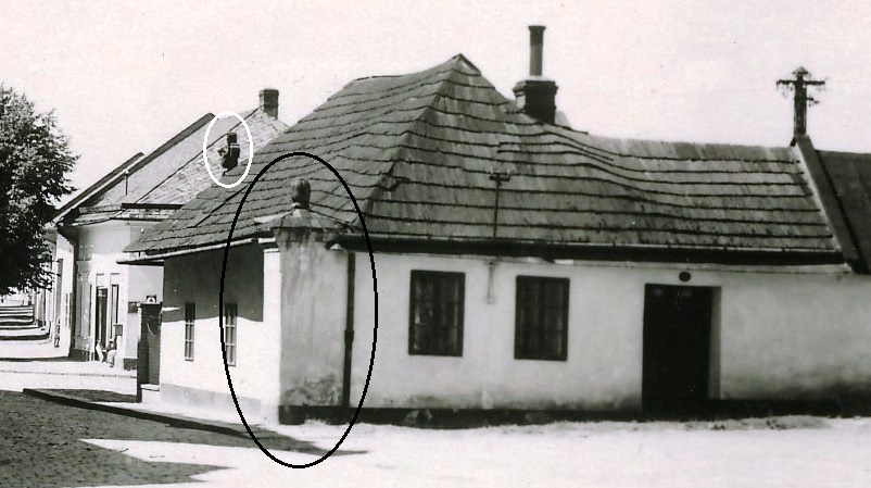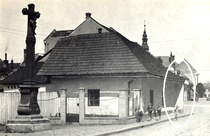 Obr. Pohled na chalupu číslo 82 hodináře Čeňka Živného před rokem 1929 se severním pilířem Vyškovské brány na tehdejším Wilsonově náměstí, v bílém oválu částečně vyčnívající kříž z roku 1757, v pozadí Vyškovská ulice.