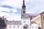 Obr. Pohled od jihu na Kroměřížskou věžovou bránu s původní budovou špitálu (vlevo) a „starou“ jednotřídní školou před její rekonstrukcí v roce 1789.