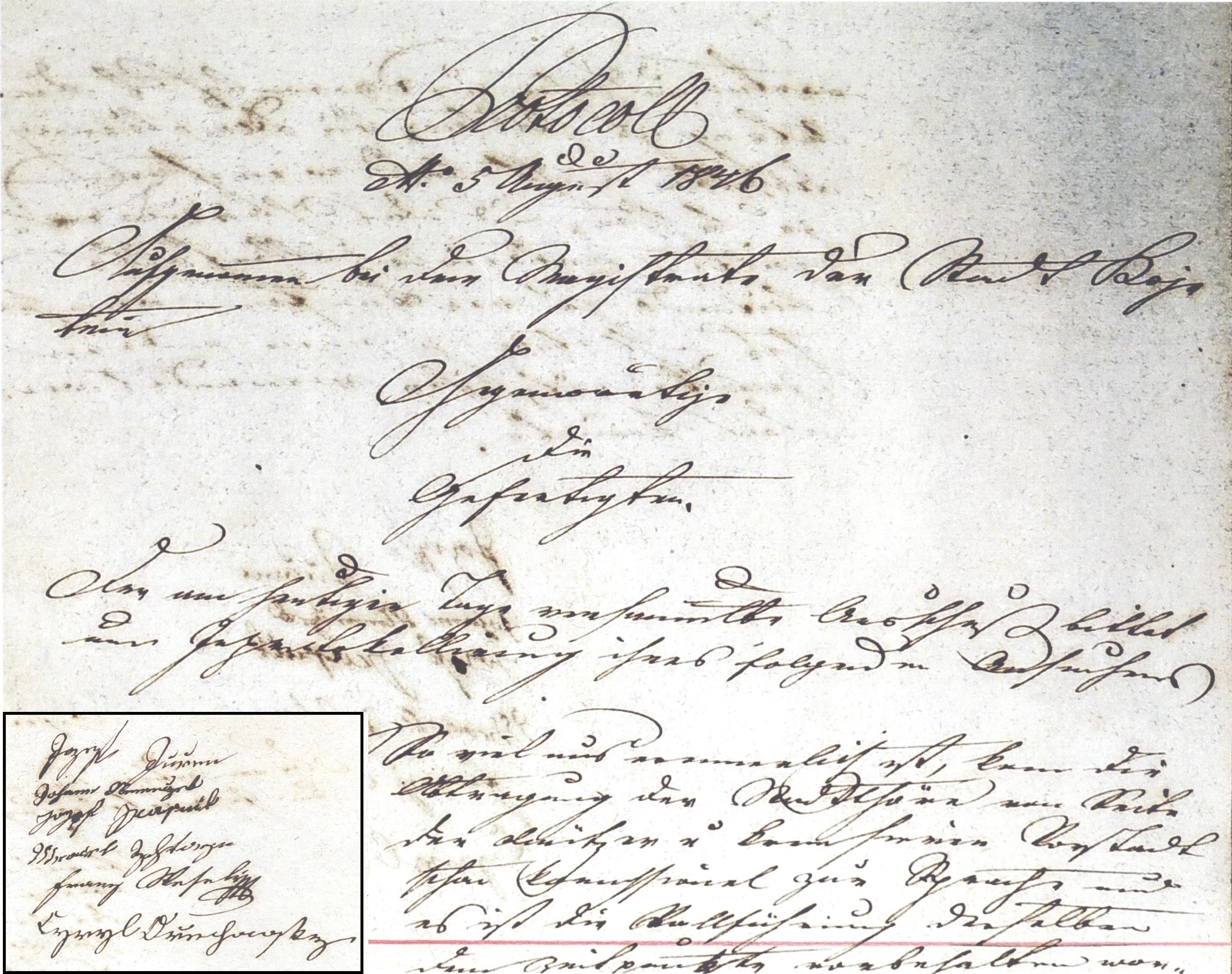 Obr. Úvod dopisu ze dne 5. srpna 1846 ve věci návrhu na zbourání městských bran a vložené podpisy předkladatelů.