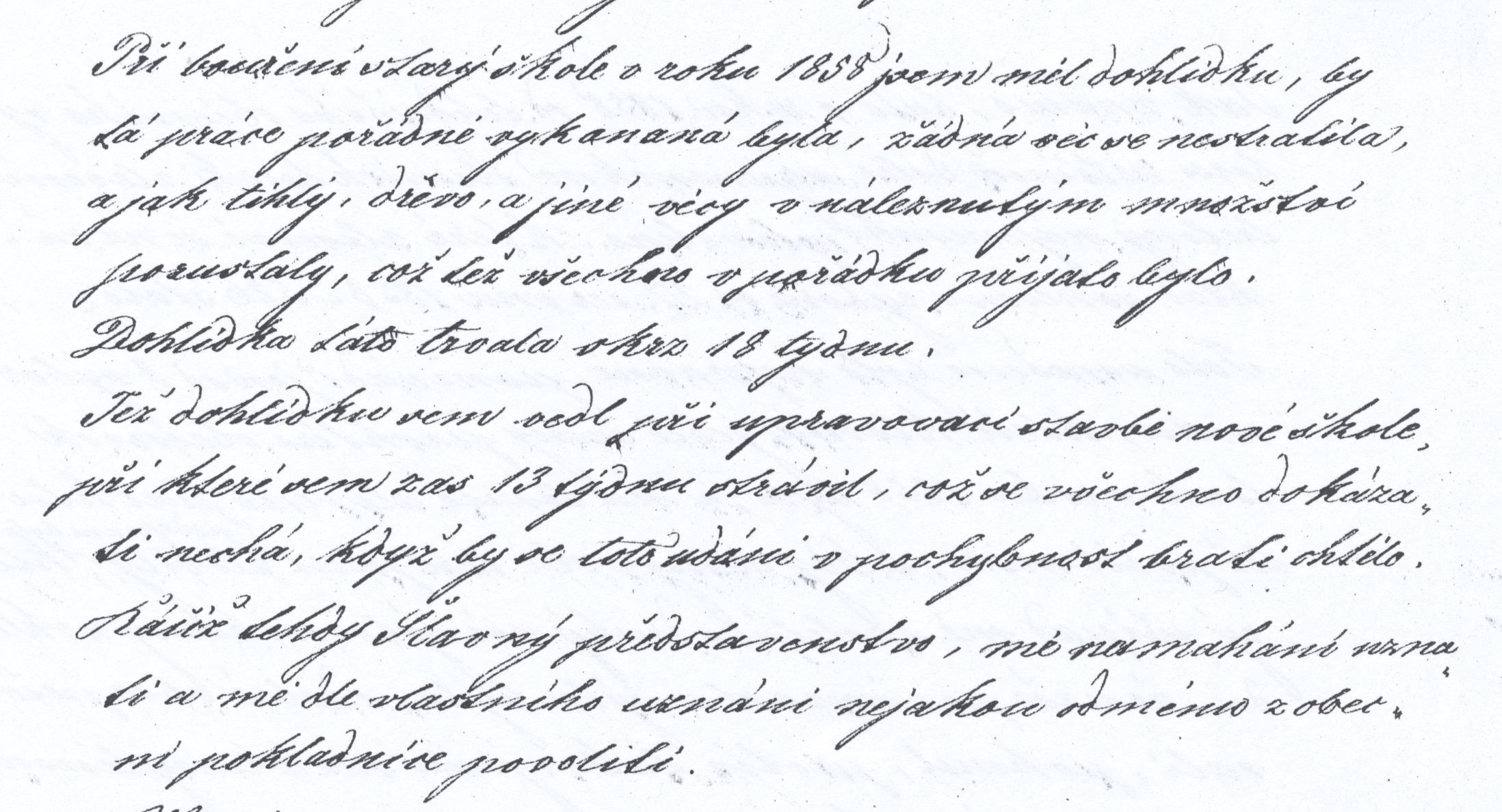 „…Při bouření starý škole v roku 1858 jsem měl dohlídku, by tá práce pořádně vykonaná byla, žádná věc se nestratila, a jak tihly, dřevo, a jiné věcy v náleznutým množství pozustaly, což tež všechno přijato bylo. Dohlídka táto trvala skrz 18 tydnu.