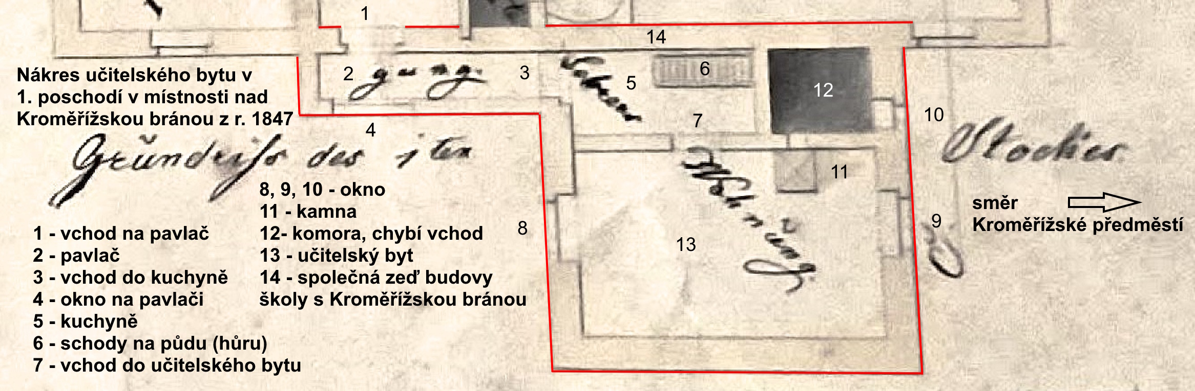 Obr. Nákres 1. patra nad průjezdem Kroměřížské brány z roku 1847 s učitelským bytem (Lehrer Wohnung).