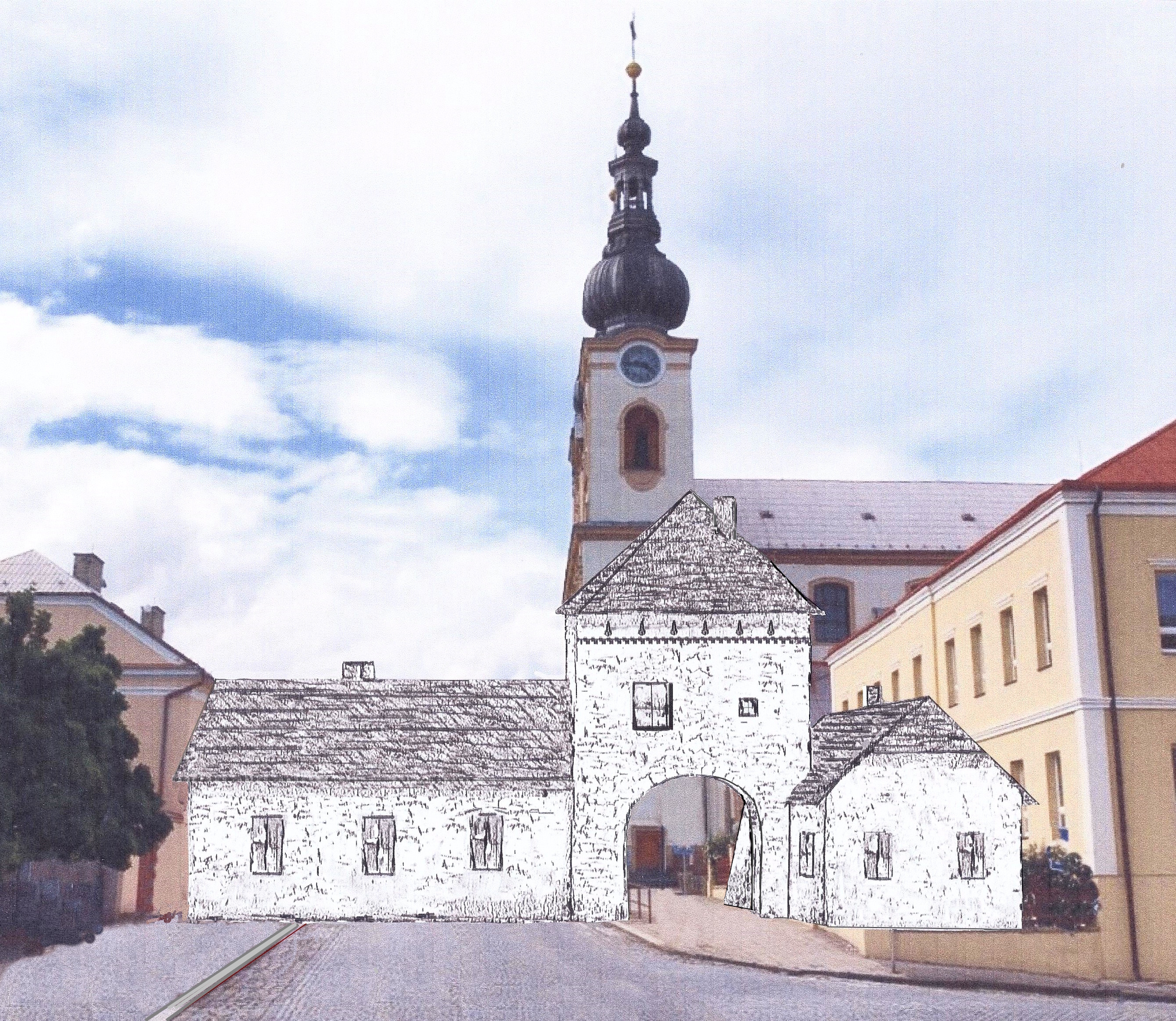 Stavební vývoj v době pozdního středověku určil, že se tato městská brána stala i do budoucna součástí jedinečné církevně duchovní a vzdělávací části města, ze tří stran uzavřené, s dominantou kostela se hřbitovem a kostnicí (castellum cum sacro campo et ossuario), naproti stojící farou (parochiā), pod níž byl vystavěn místní špitál (hospitale), sousedící se zdí městské brány (porta civitatis), u které byla z její druhé strany postavena škola (schola).