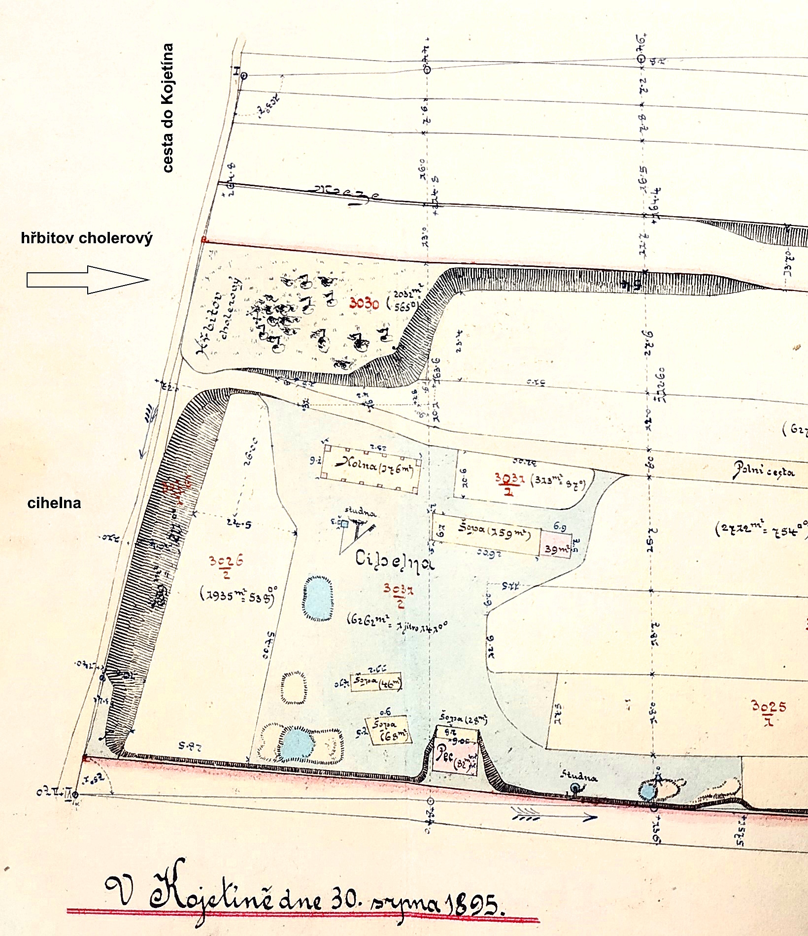 Obr. Nákres cholerového hřbitova a cihelny z roku 1895.