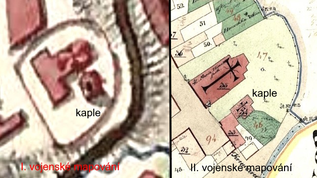 Obr. Kaple sv. Kříže s kostnicí na mapách I. a II. vojenského mapování.