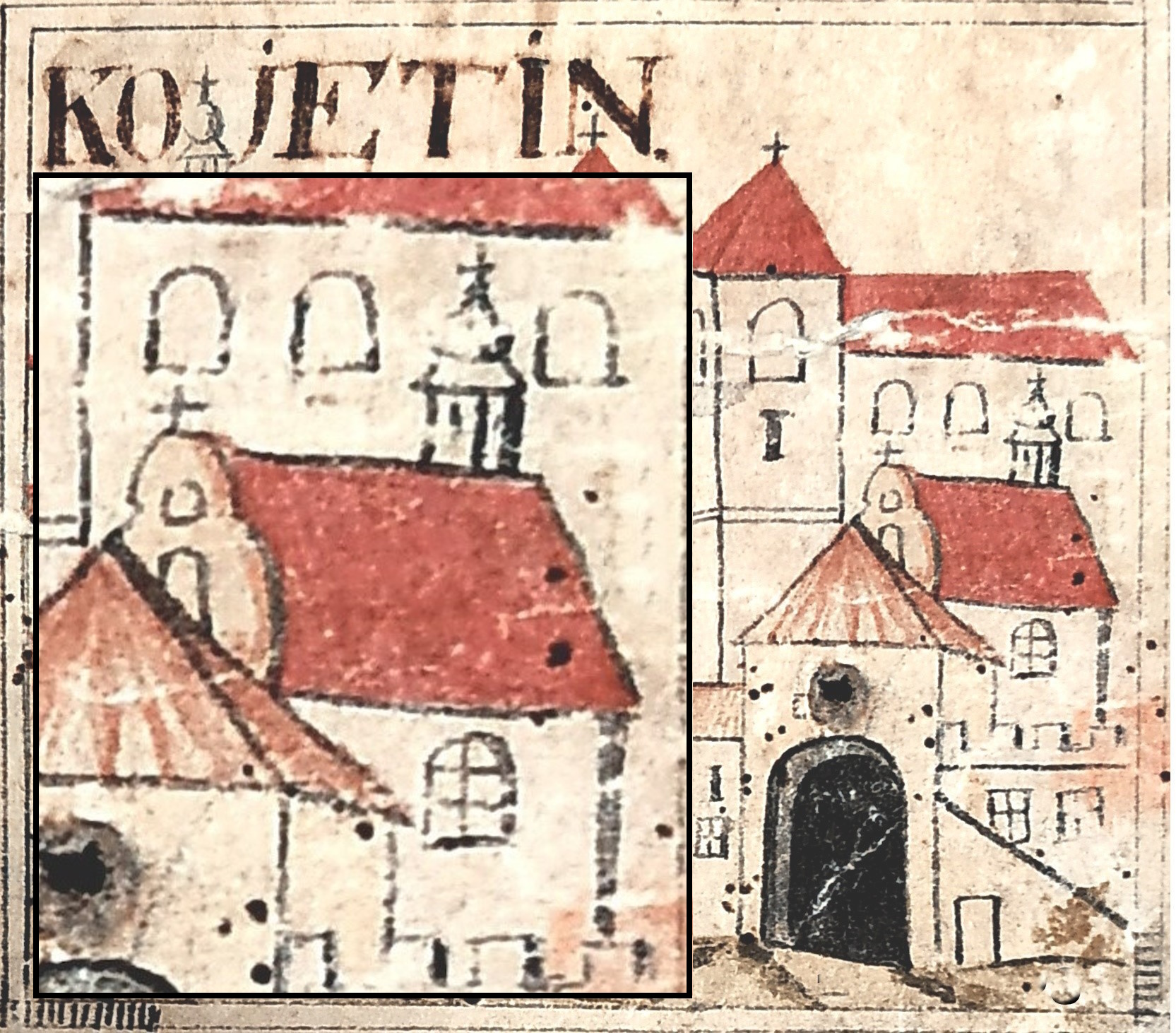 Obr. Kaple - kostnice zakreslená na vedutě města Kojetína z období kolem roku 1800, v popředí Kroměřížská brána.