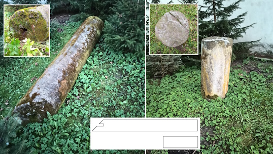 Obr. Části původního mariánského sloupu z roku 1704 z pískovce, nacházející se poblíž severní zdi kostela.