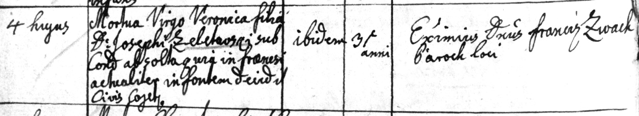 Obr. Zápis v matrice zemřelých ze dne 4. srpna roku 1755 o úmrtí Veroniky Želetavské.