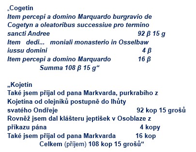 Pokud výše uvedený zápis (Účet pokladníka) aplikujeme na období faktického držení Kojetína pražskými biskupy, lze se domnívat, že město spravovali purkrabí, sídlící na tvrzi, kterou zde koncem 13. století nechal zřídit z kostela biskup Tobiáš. Tito purkrabí odevzdávali biskupům peněžní částky z poplatků či služeb za určité časové období.