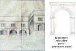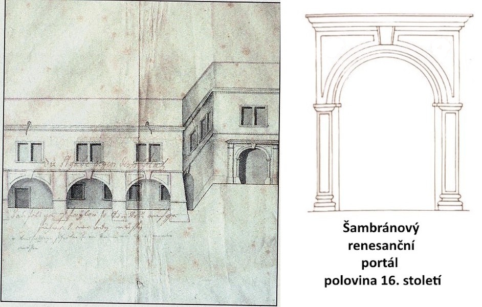 Obr. Nákres budovy panského hostince z roku 1787 s podloubím a portálem a ukázka šambránového portálu.