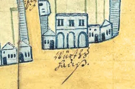 Obr. Pohled na dům číslo 8 s hostincem – „Würtshaus“ – na nákresu z roku 1726.