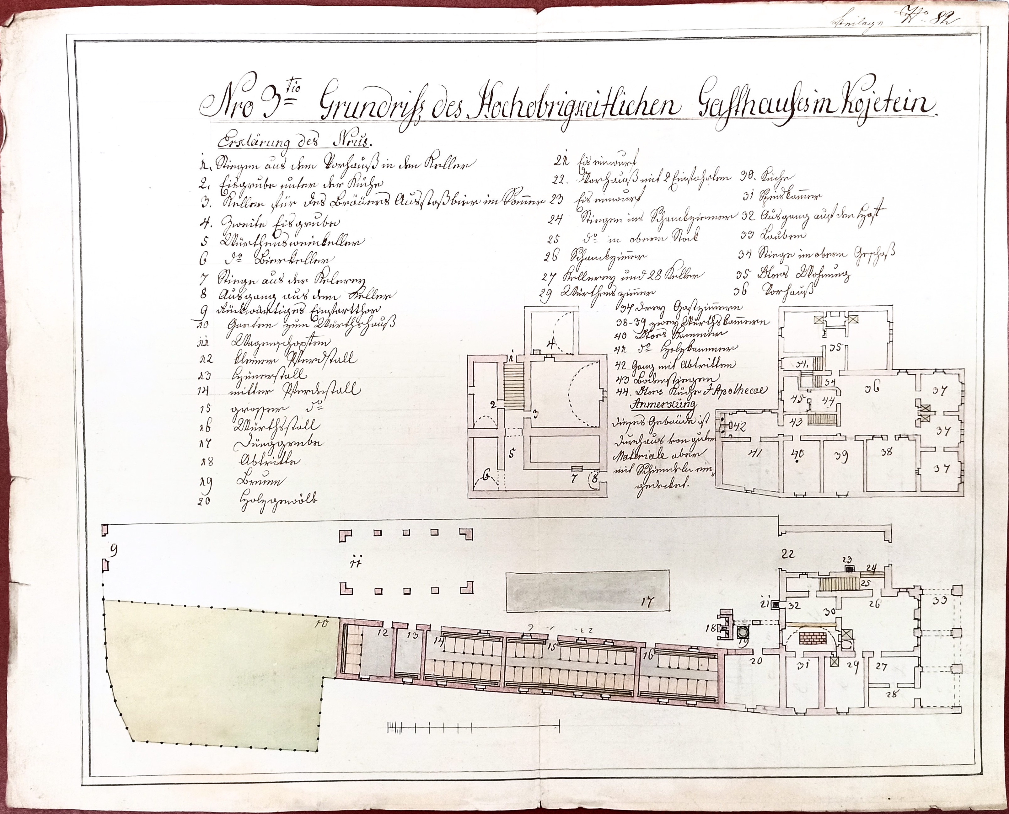 Z tohoto období, kolem roku 1817, se zachoval německy psaný nákres budovy hostince – „Nro 3tio Grundriss des Hochobrigkeitlichen Gasthauses in Kojetein“, ve kterém jsou zakresleny sklepy, přízemní prostory včetně hospodářských budov a zahrady i ubytovací místnosti v poschodí.