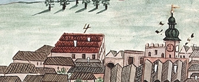 Obr. Pohled na hostinský panský dům číslo 8 na vedutě z roku kolem 1730.