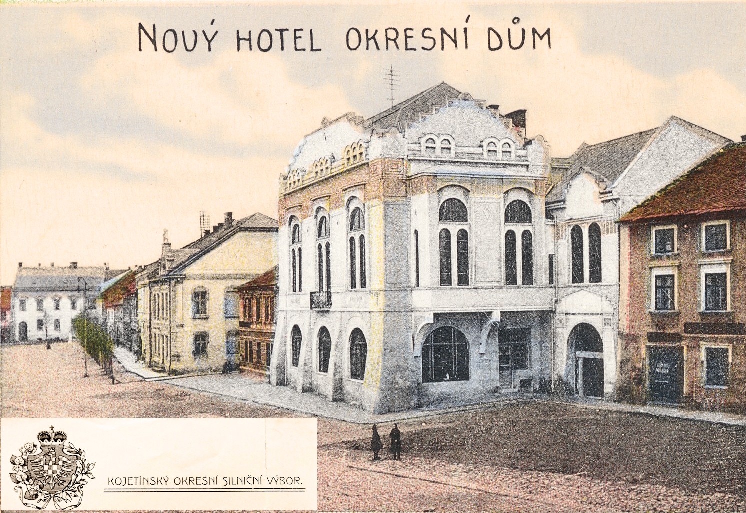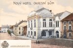 Obr. Pohled na tzv. Okresní dům z roku 1912 – kolorovaná pohlednice s vloženým znakem silničního výboru.