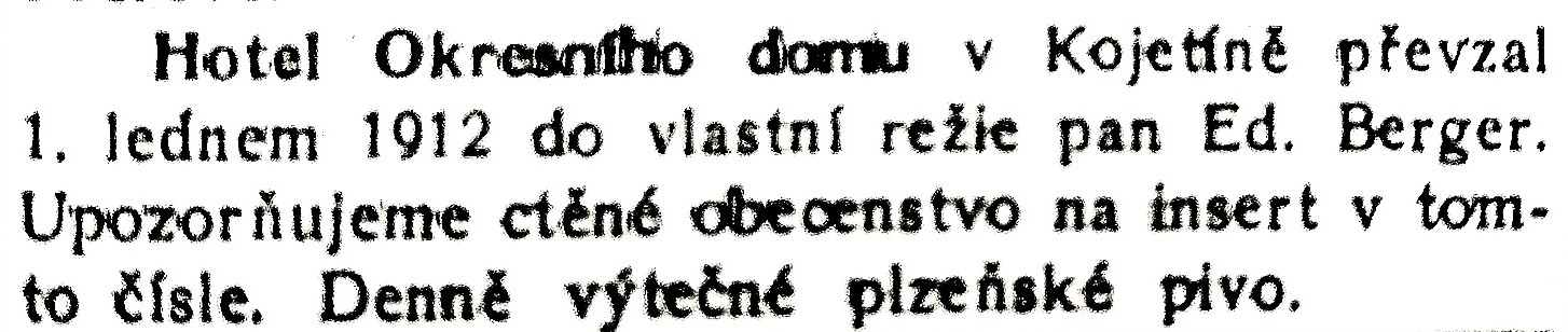 Hotel Okresního domu převzal dnem 1. ledna roku 1912 do vlastní režie, jako nájemce, hoteliér Eduard Berger.