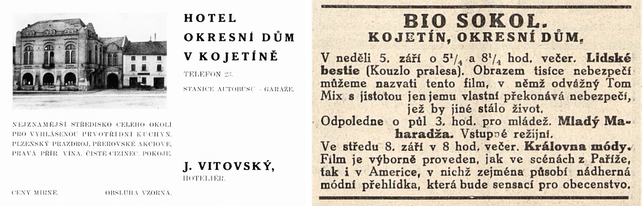 Obr. Novinový inzerát na služby v Okresním domě z roku 1933 a upoutávka z roku 1926 na promítání filmu.