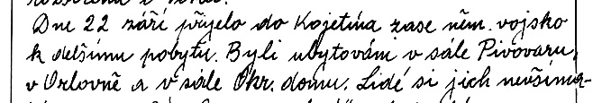 Obr. Zápis v kojetínské kronice o ubytování německých vojsk v roce 1940 v Okresním domě.