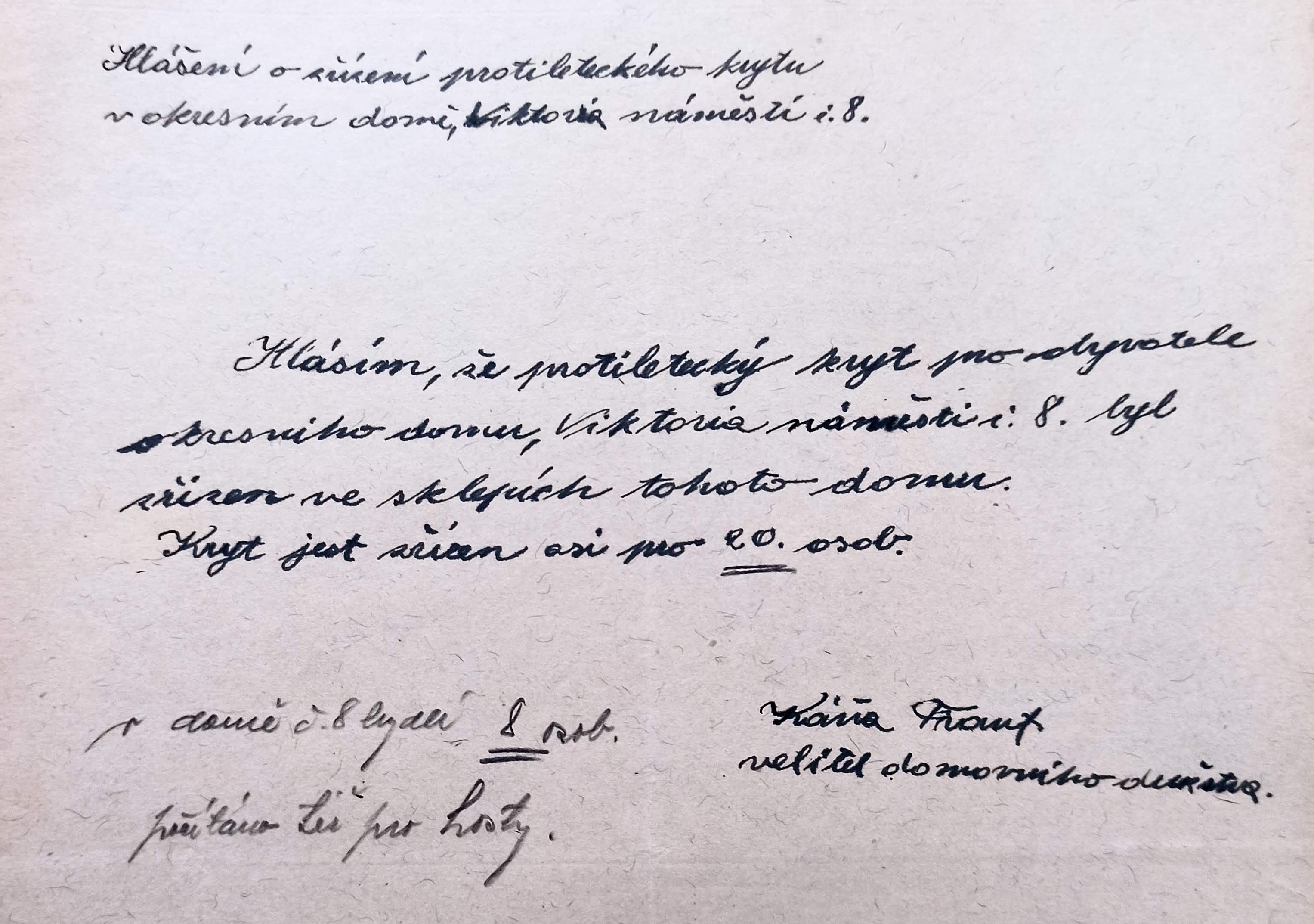 Obr. Hlášení nadřízeným orgánům o zřízení protileteckého krytu pro 20 osob v Okresním domě (nedatováno).