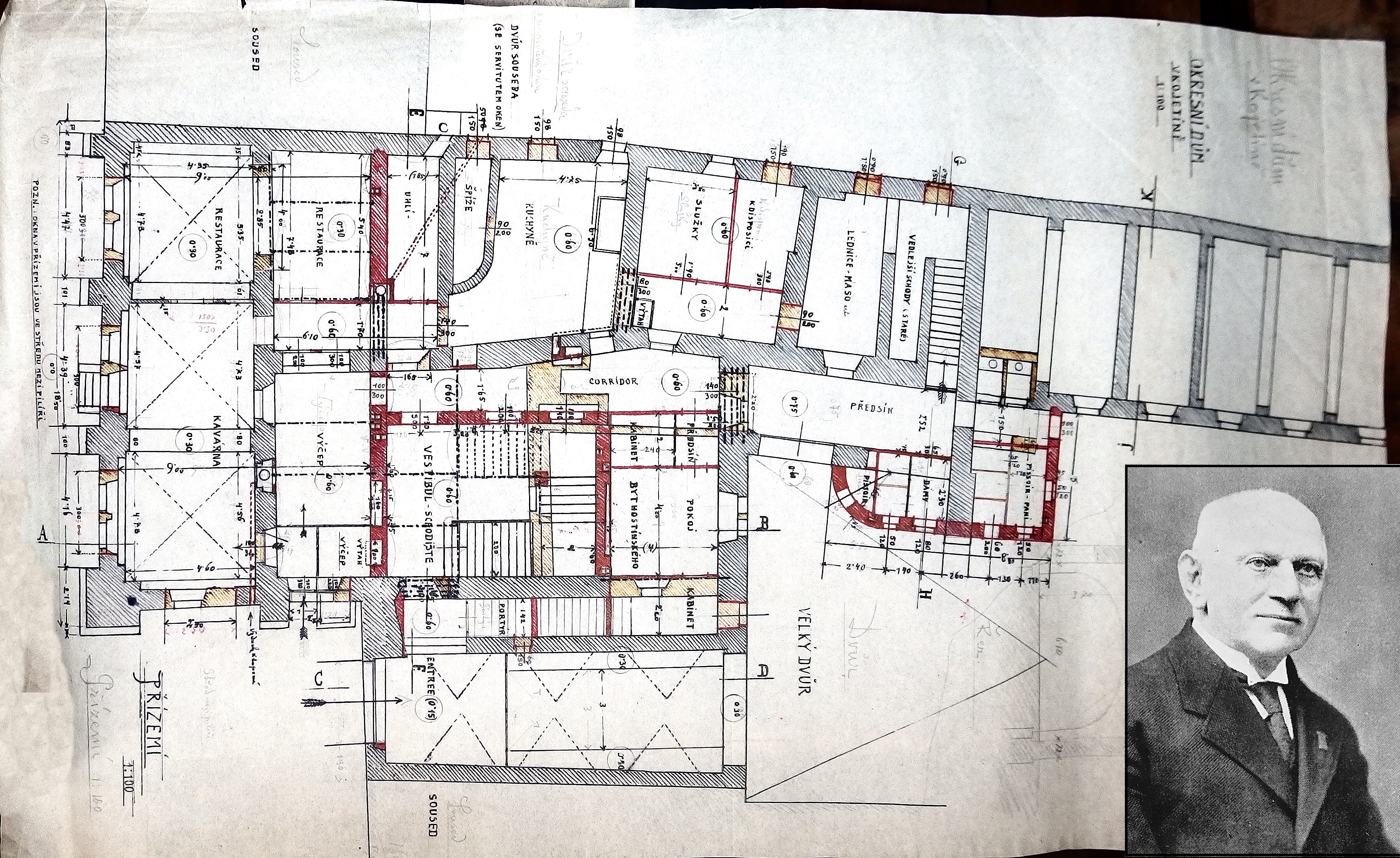 Obr. Půdorys přestavby přízemí, vpravo dole portrét stavitele Josefa Ryšavého (narozen 15. října 1854 v Náchodě – zemřel 19. července 1949 v Kojetíně).