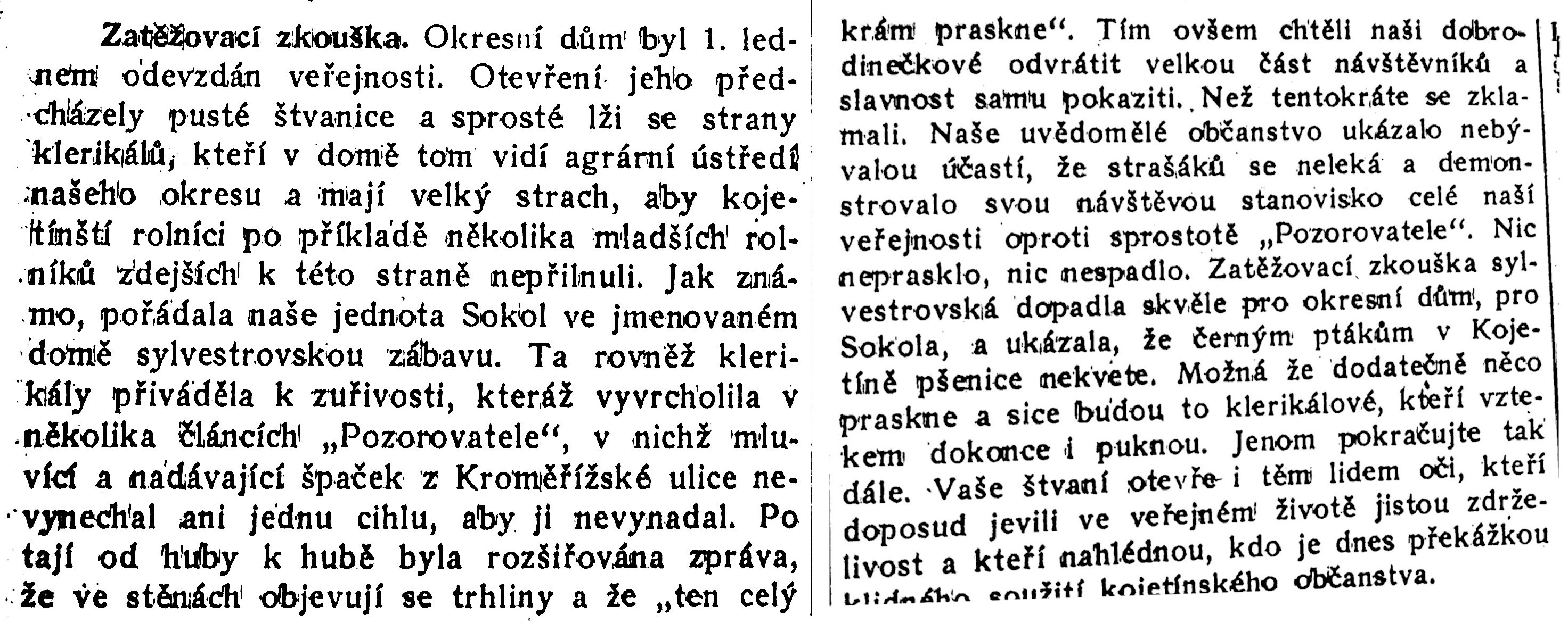 Výše uvedené organizace Sokol a Orel a jejich příznivci se v novinách vzájemně osočovali. Příkladem je článek z měsíce ledna roku 1912, nazvaný Zatěžkávající zkouška, odkazující na Silvestrovskou zábavu Sokolů v roce 1911.
