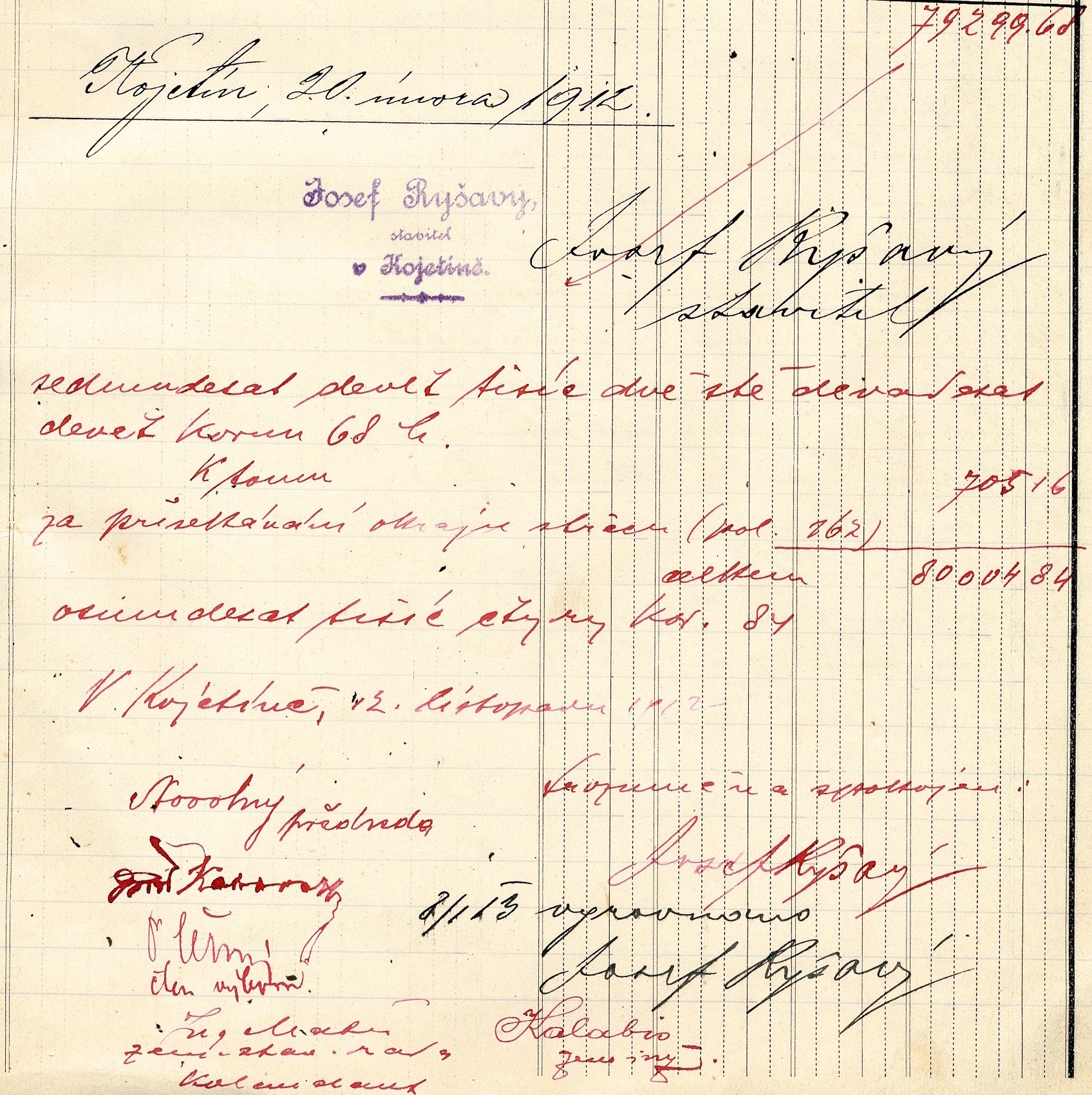 Závěrečná částka je uvedena s podpisy stavitele Josefa Ryšavého, předsedy Okresního silničního výboru Jana Novotného, členů výboru Rudolfa Kalovského z Hasičkého sboru a Dr. Černého, dále zemského inženýra Emanuela Kalabio a zemského stavebního rady – kolaudanta inženýra s nečitelným podpisem.