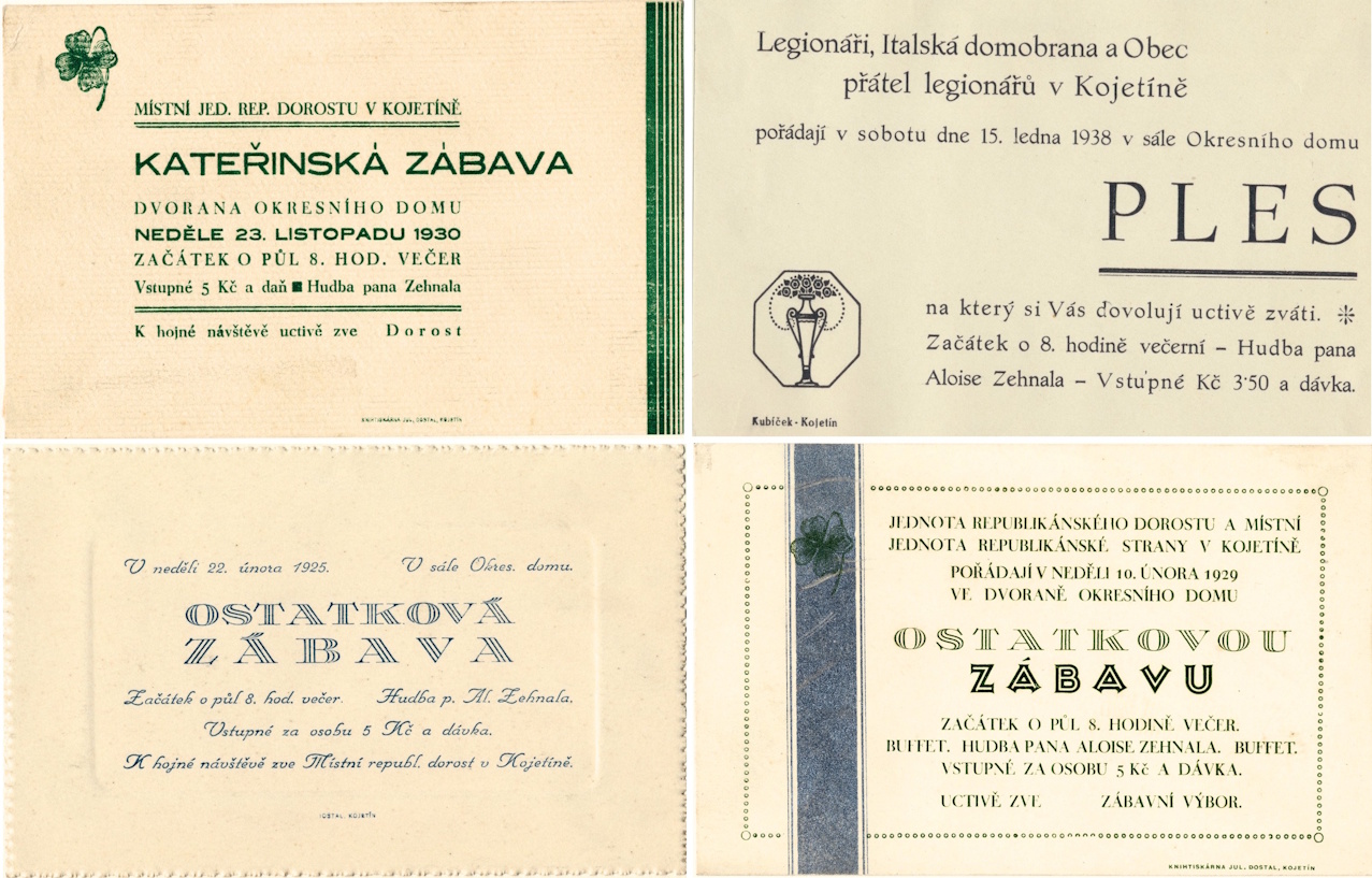 Obr. Pozvánky na zábavné akce konané v Okresním domě v meziválečné době.