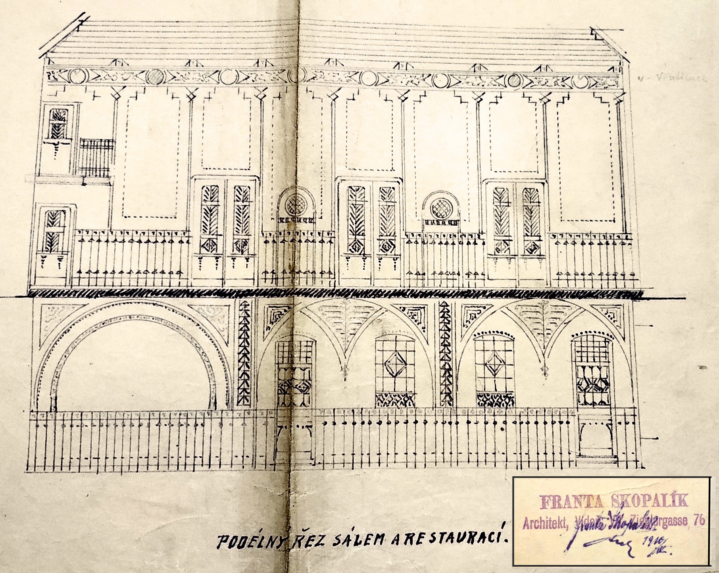 Obr. Jeden z nákresů budoucího interiéru Okresního domu, v rámečku razítko a podpis F. Skopalíka z roku 1910.
