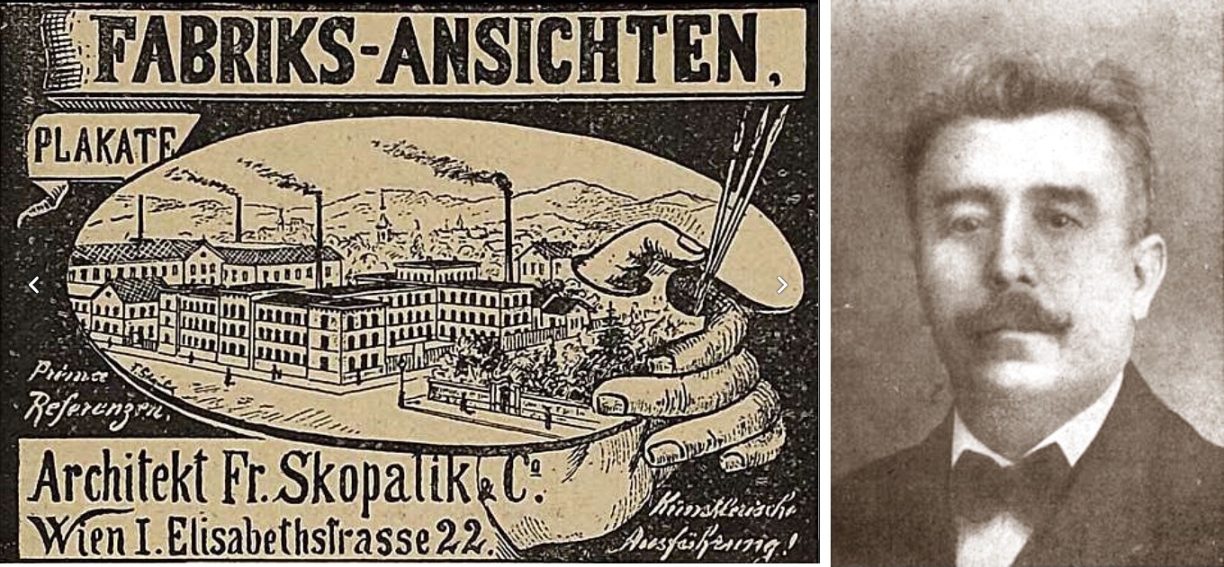 Obr. Pohled na kresbu jedné z vídeňských továren a portrét 65letého architekta Skopalíka.