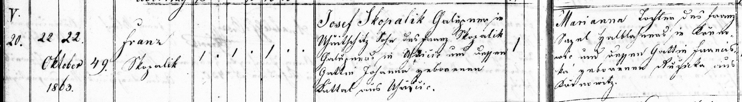 Obr. Zápis o narození Františka Skopalíka dne 22. října roku 1863 v uhřičické matrice.