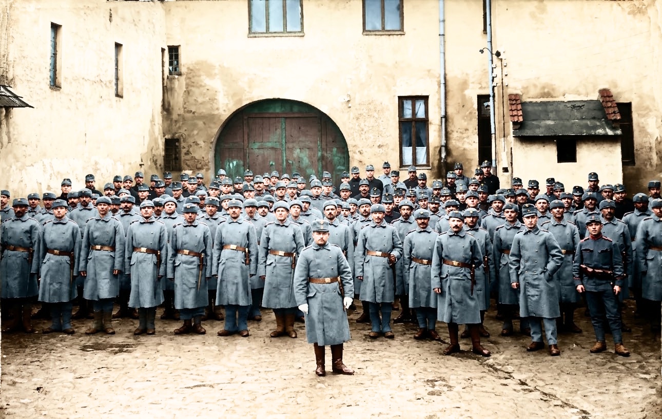 Obr. Snímek c. a k. vojáků na nádvoří Okresního domu v dubnu roku 1915.